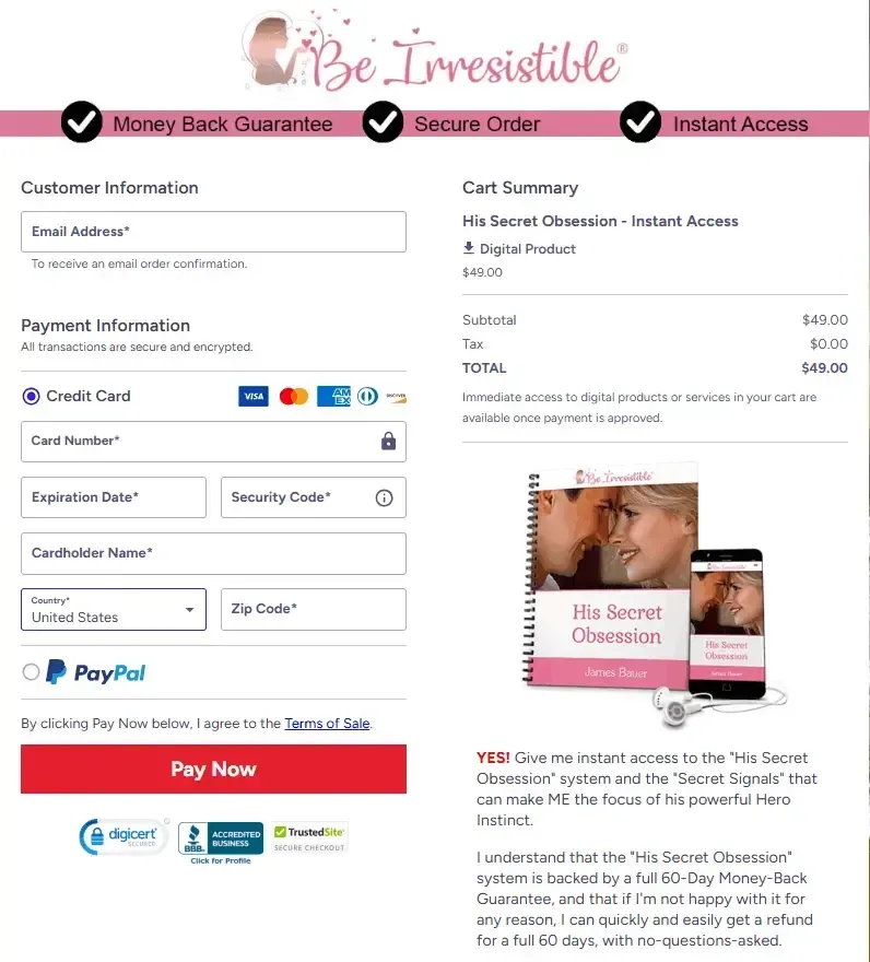 Your online privacy is one thing you can be sure we so much prioritize here and thus do not worry about losing any sensitive credentials while making your purchase of His Secret Obsession Program from us. Besides, You can count on Clickbank's excellent reputation and vast experience in online transactions to help protect your purchases.